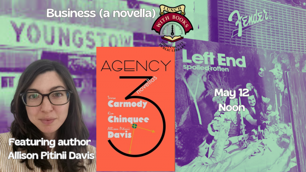 Writer Allison Pitinii Davis returns to discuss her novella Business, about the nightlife of working-class women on the eve of Youngstown, Ohio’s deindustrialization. When the lives of an auto factory worker and trucking motel innkeeper become entwined after a chance encounter at a nightclub, they become agents in each other’s liberation. Allison says she is especially excited to share this novella with audiences who remember the 1970s nightlife scene in industrial areas. Part of her reading will include sharing music and photos of the actual bands and spaces that inspired the events in the novella, including Left End, a popular Youngstown glam rock band made up of local autoworkers. Her novella is geared towards audiences who value the experiences of women and their labor, working-class nightlife culture, inter-generational family businesses, and local Steel Belt history.
